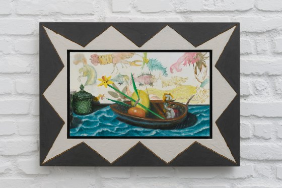 “fame o ingordigia (hunger or greed)”, 2025, olio su carta, cornice in resina, 38 x 46 cm.