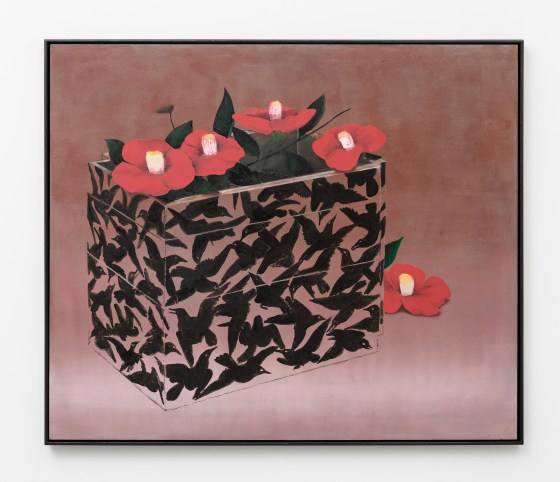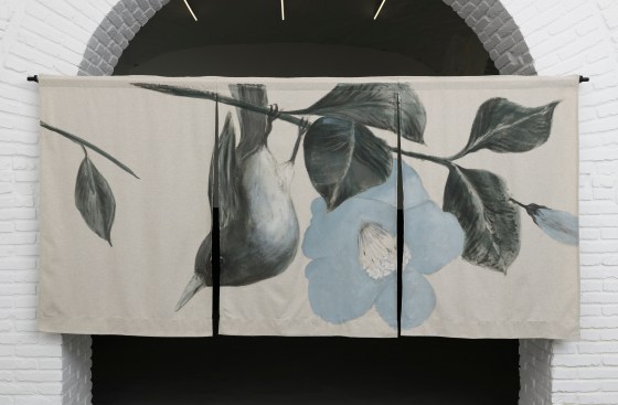 “Noren con camelie e passerotto”, 2025, acrilico su tela di canapa, 153 x 306 cm.