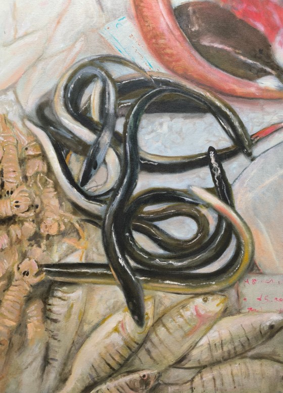 “Fatima e il miracolo dei pesci”, 2025, olio su tela, 45 x 70 cm.